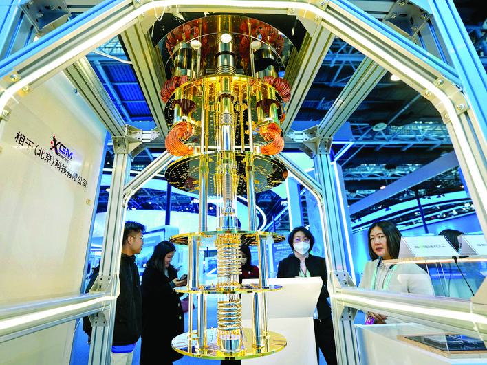 3月28日,在中关村展示中心常设展内,参观者在了解展示的大型超导量子计算原型机。新华社发